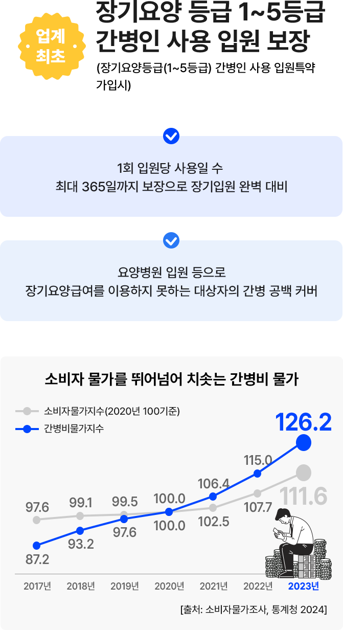 특약보험기간 중 「피보험자가 "장기요양상태 보장개시일" 이후에 “장기요양(1~5등급) 상태”로 판정되고, 그 질병 또는 재해로 인한 직접적인 치료를 목적으로 특약보험기간 중 1일 이상 계속하여 요양병원에 입원하며 간병인을 사용하여 실질적으로 간병서비스를 이용」하였을 때(다만, 간병인 사용입원일수 1일당, 1회 입원당 사용입원일수 365일 한도) |